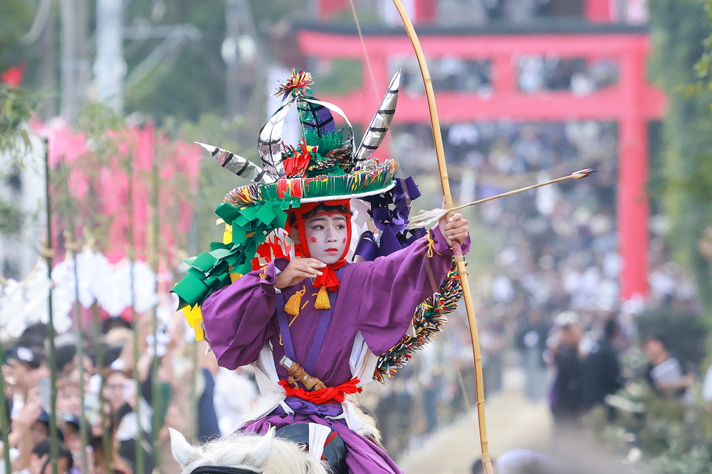 狩衣装束にあやい笠を身にまとい、弓受けの儀により神となった射手は神馬とともに馬場を疾走します。